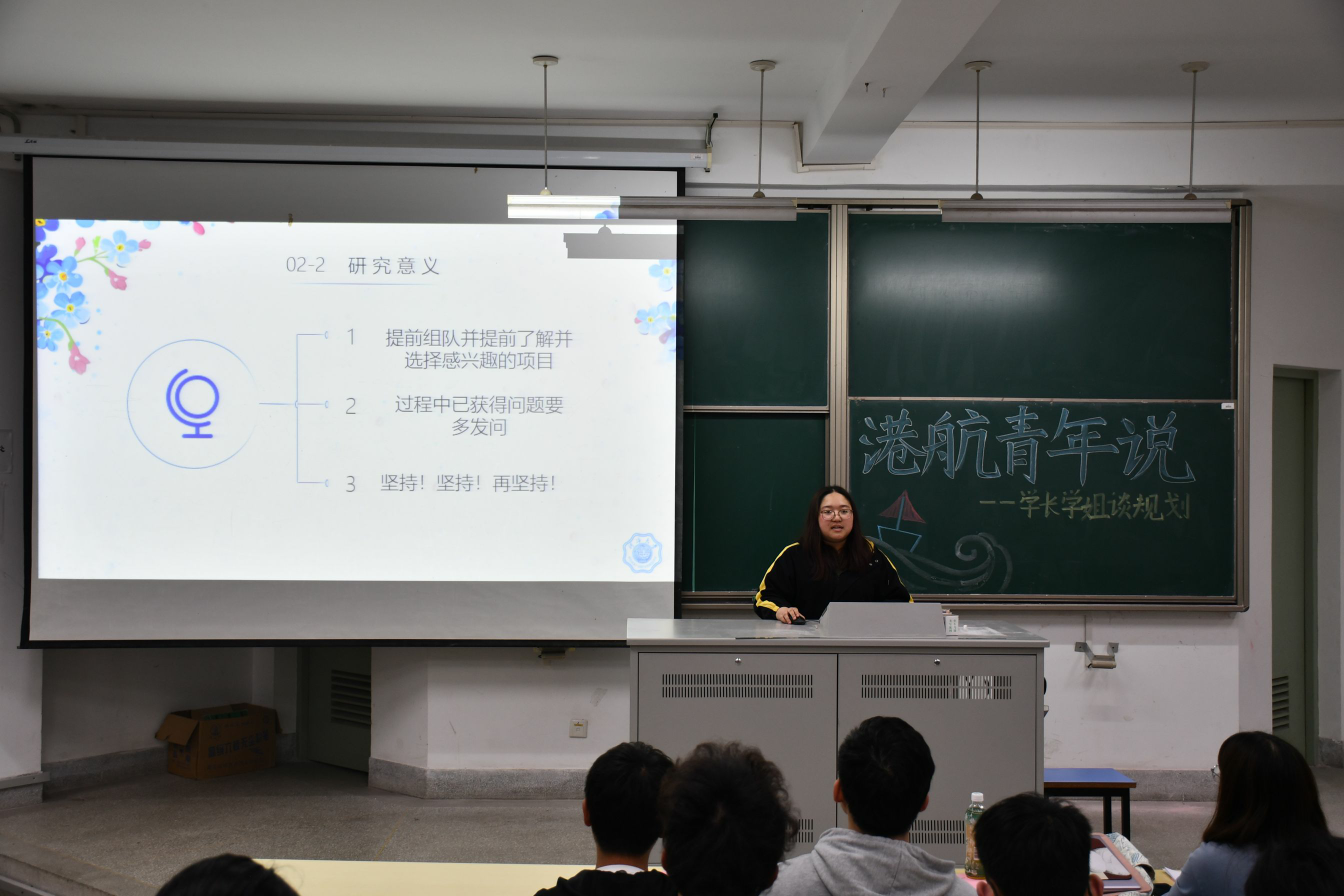 丁星宇向同学们讲述了港航、海资专业同学的就业方向,告诉同学们要多锻炼自己的写作、办事、沟通交流等方面能力,并且一定要坚持锻炼自己的身体,让同学们获益匪浅。