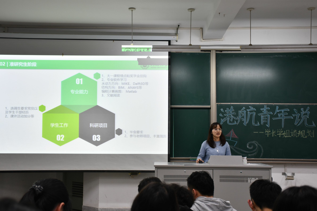 王博文向同学们介绍了港航、海资专业对口的工作单位以及这些工作单位的用人标准,告诉大家要多参加工作实习,选择适合自己的工作,让大家对工作单位的选择有了一定的了解。