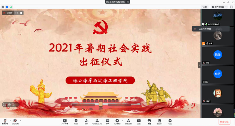 为引导和帮助广大青年学生在社会课堂中上好“大思政课”,通过社会实践加强改进大学生思想政治教育、深化爱国主义教育,2021年7月11日晚8点,av影片 通过腾讯会议举行暑期“三下乡”社会实践活动出征仪式,学院2020级辅导员林晨老师主持仪式。