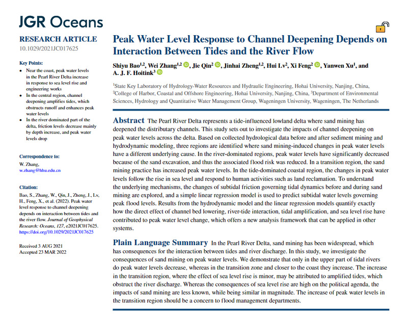 近日,郑金海教授和张蔚教授指导的2019级硕士研究生鲍仕昱在国际学术期刊《Journal of Geophysical Research: Oceans》(中科院一区TOP)上发表了题为“Peak water level response to channel deepening depends on interaction between tides and the river flow”的学术论文。这是该研究团队近3年来继在《Water Resources Research》、《Coastal Engineering》、《Journal of Hydrology》和《Hydrology and Earth System Sciences》等国际权威刊物发表的又一重要学术成果。这项研究对于掌握高强度人类活动影响下河口三角洲洪潮水位变化具有重要的科学意义。