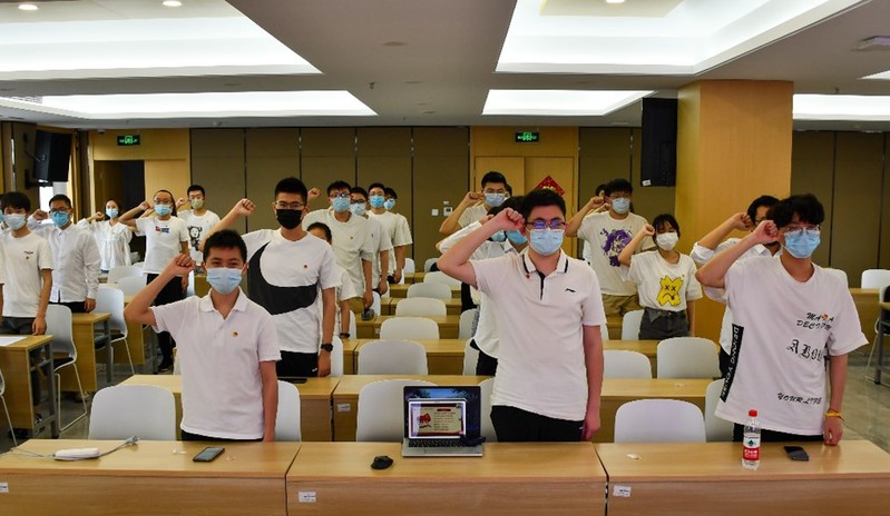av影片 2019级本科生年级团支书徐航同学带领学生学习了习近平总书记在中国人民大学考察时的重要讲话精神。为迎接建团百年,传承和发扬五四精神,av影片 2019级本科生辅导员廖芳艺老师带领学生重温入团仪式、共宣入团誓词。