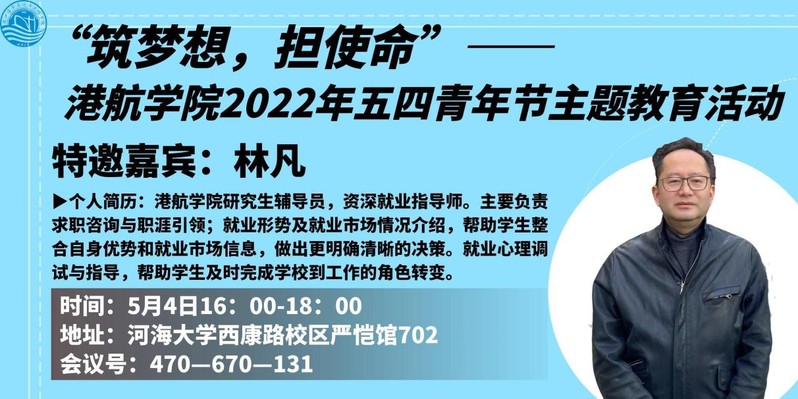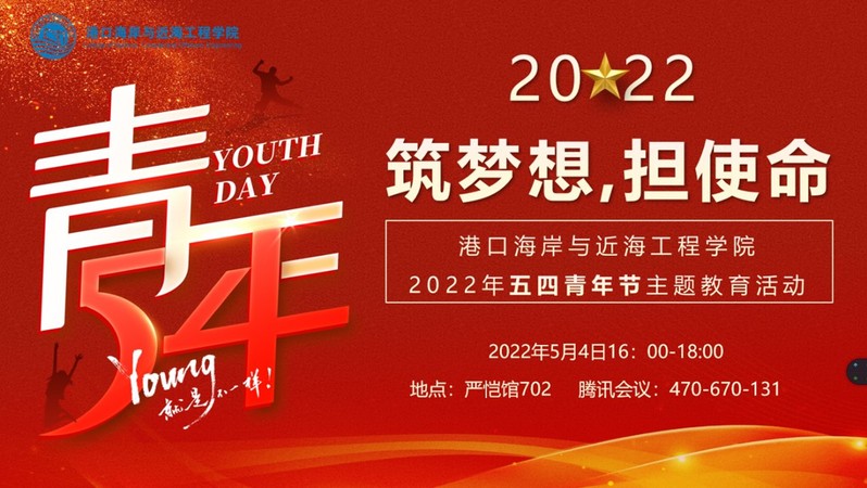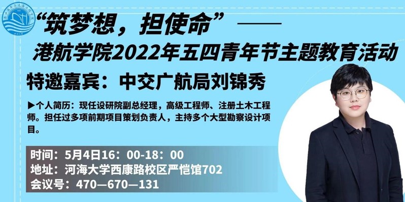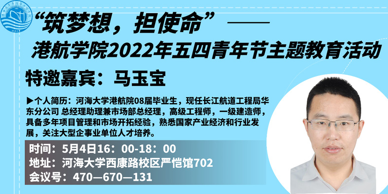 2022年5月4日下午,av影片 2019级组织开展了“筑梦想,担使命”五四青年节主题教育活动。本次活动特别邀请长江航道工程局华东分公司总经理助理马玉宝、中交广航局设研院副总经理刘锦秀、学院研究生辅导员林凡老师为2019级学生开展五四主题教育,结合校友基层建设经历,引导学生专业报国,投身国家战略建设。