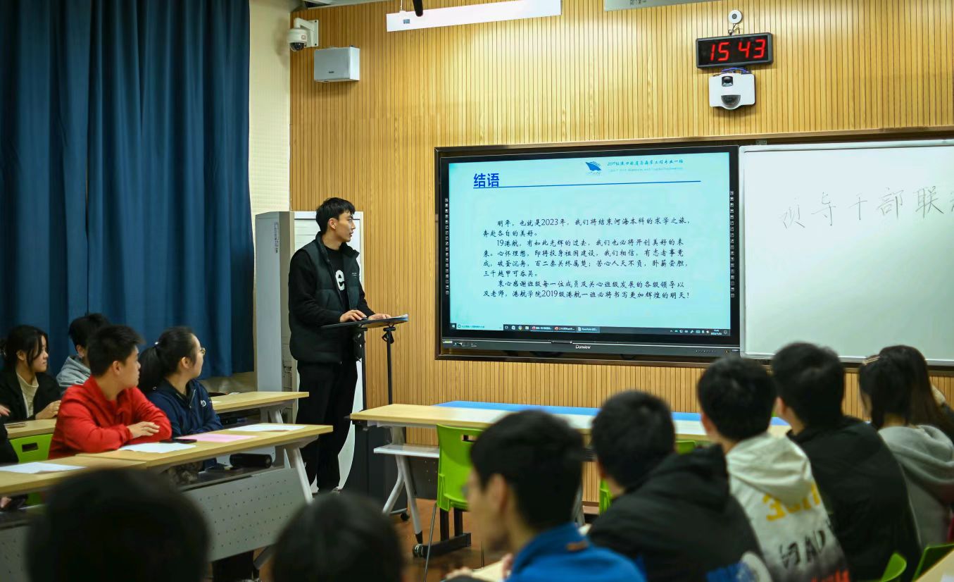 11月23日下午,2019级港航1班召开“学习贯彻二十大,毕业就业创青春”主题班会。校党委常委、党委统战部部长、党委办公室主任朱宏亮、av影片 党委书记张俊基、班导师及辅导员出席活动。班会由班长季一鸣主持。
