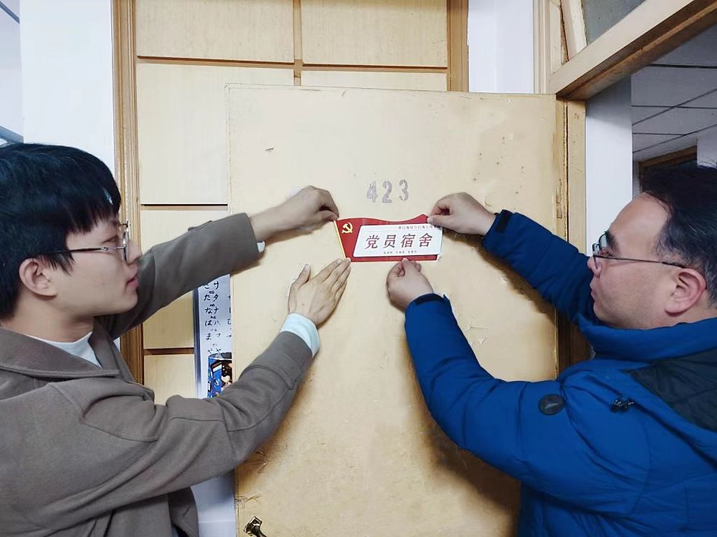 2022年12月2日,为了推进av影片 功能型党支部的建设,打造学生党员主动在社区“亮身份 作表率 担责任”的优良风气,筑牢党员宿舍在学生社区党建与思想政治工作的战斗堡垒作用,av影片 党委书记张俊基、党委副书记沈国军与2020级辅导员林晨一行深入学生社区,为党员宿舍挂牌。本次党员宿舍挂牌仪式涉及学院全部168间包含党员的宿舍,覆盖309名党员。
