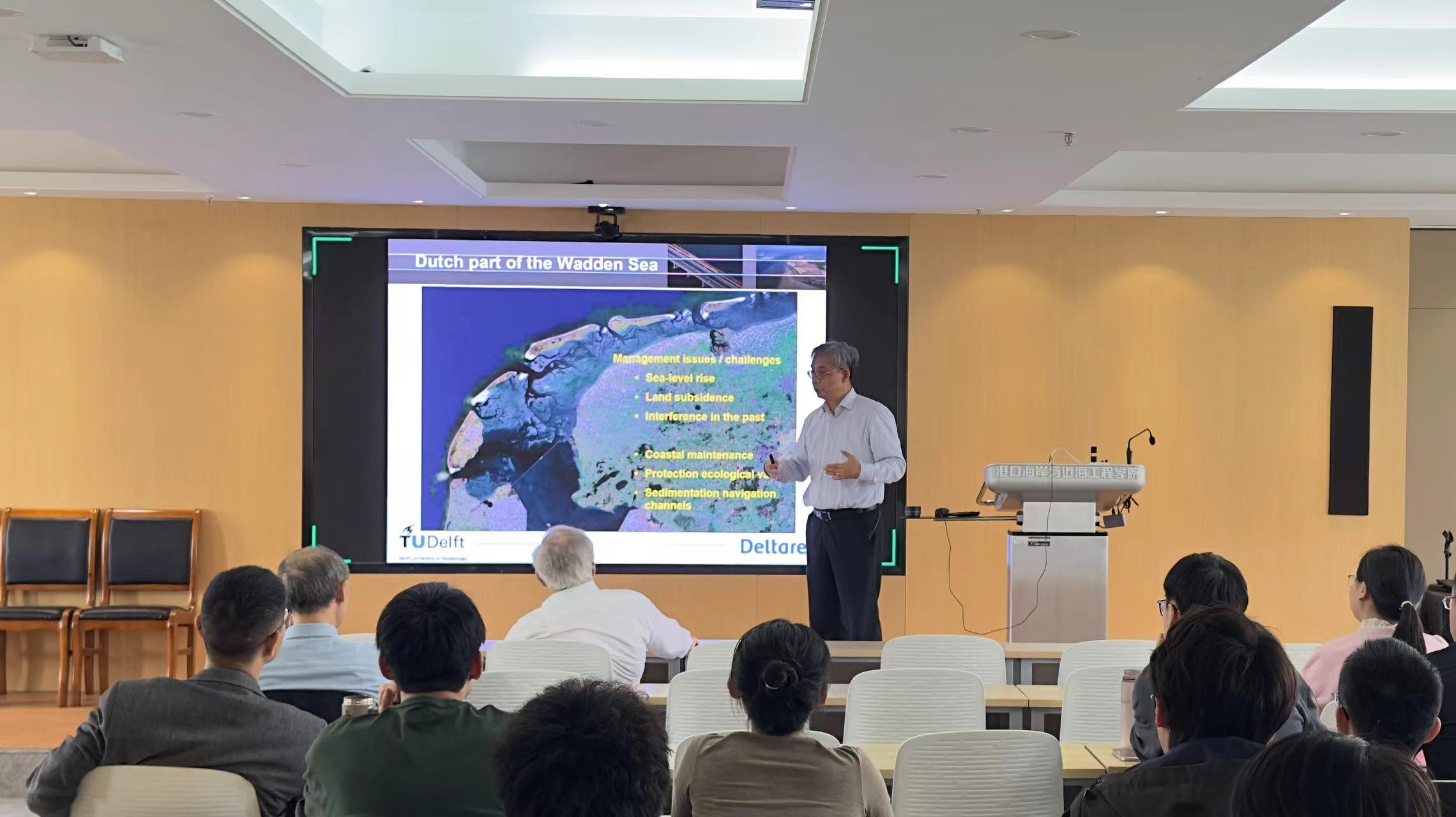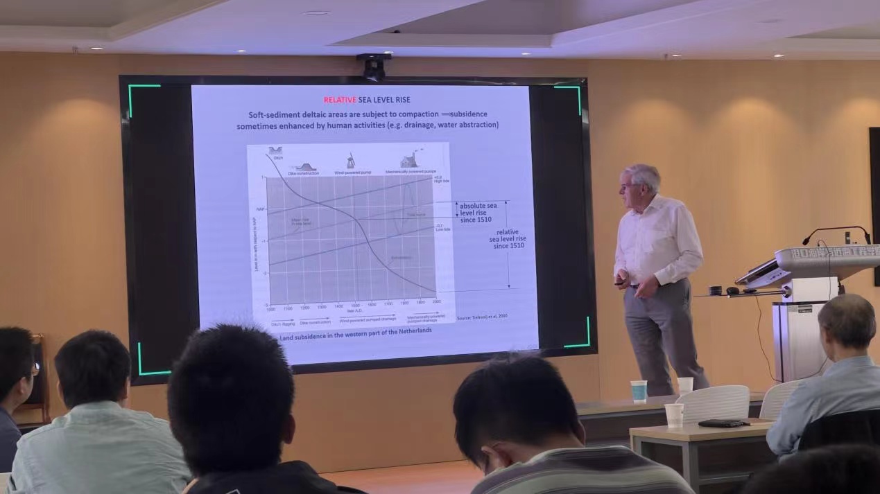Wang Zhengbing教授在报告中以荷兰瓦登海区域为例介绍了潮滩系统的水沙特性及其目前面临的问题与挑战,如海平面上升速率加速、开采导致的土地沉降以及海岸线后退等;同时,就侵蚀性海岸地区的防护问题提出了治理思路,并以荷兰的“补沙引擎”为例对其进行深入讲解。