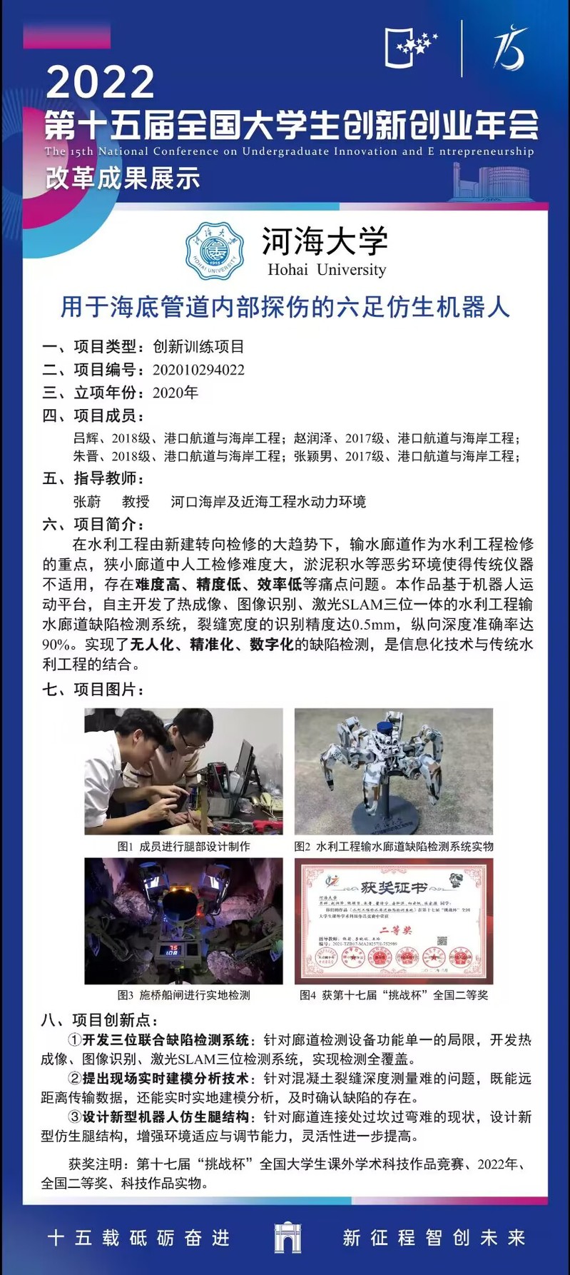 我院吕辉、赵润泽、朱晋、张颖男等学生主要参与的国家级创新训练项目《用于海底管道内部探伤的六足仿生机器人》入选第十五届全国大学生创新创业年会改革成果展;同时,我院创业项目成果南京神禹浚泰工程检测有限公司入选“国创计划”十五周年创业成果展。