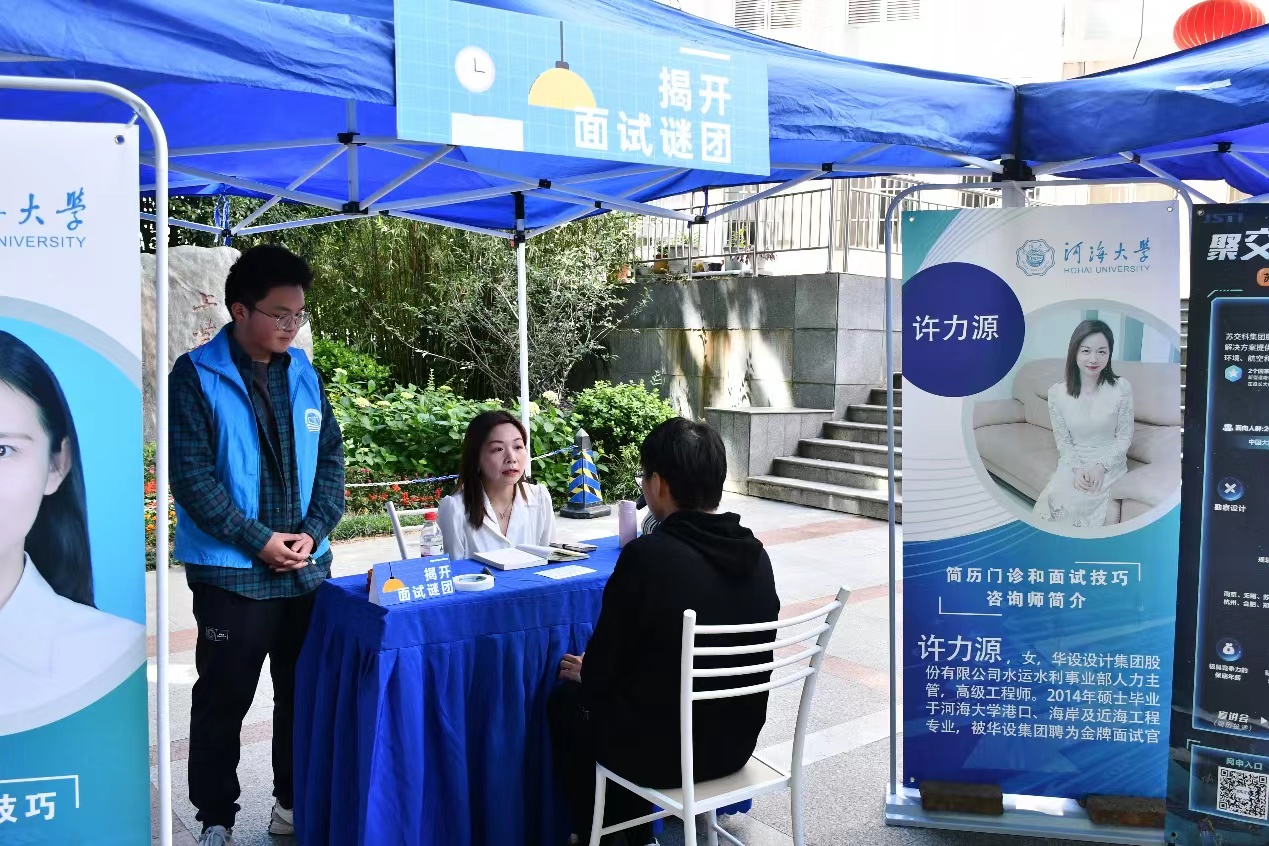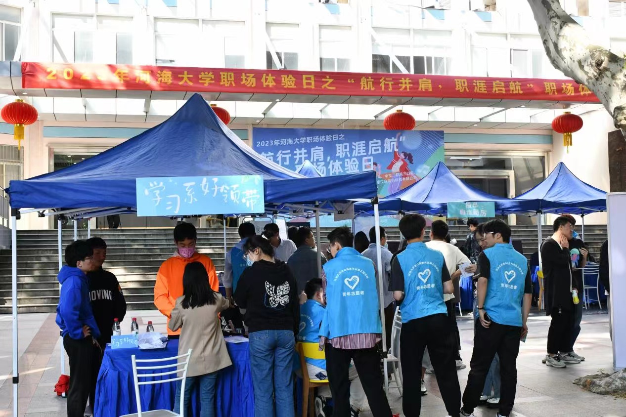 2023年5月11日下午,由av影片 学生就业指导中心、av影片 、“航行并肩”生涯工作室主办,由环境学院、海洋学院协办的“航行并肩,职涯启航”职场体验日活动在西康路校区严恺馆前顺利举行,邀请到苏交科集团股份有限公司、华设设计集团、中建一局一公司、中交二航局三公司、江苏都市交通规划设计研究院有限公司、金风科技股份有限公司、南京汉欣医药科技有限公司等企业参与,av影片 学生工作处副处长、就业指导中心主任赵海伟、av影片 党委副书记沈国军、环境学院党委副书记戴玉珍、海洋学院党委副书记吴昊等到现场指导活动,活动面向全体学生开展。