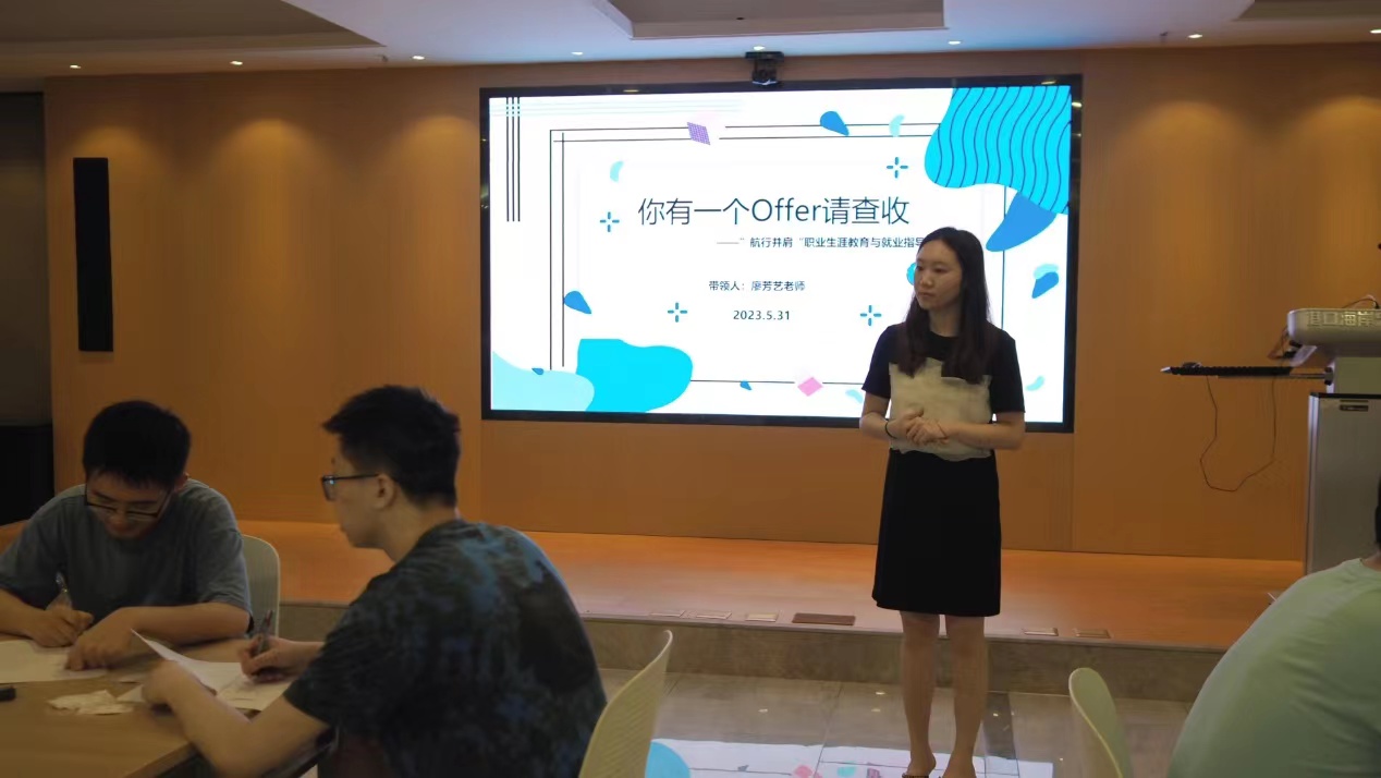 2023年5月31日晚,由av影片 “航行并肩”职业生涯教育与就业指导工作室主办的“你有一个offer请查收”辅导活动在西康路校区严恺馆702顺利举行。“航行并肩”生涯工作室带领人廖芳艺老师主持本次活动。