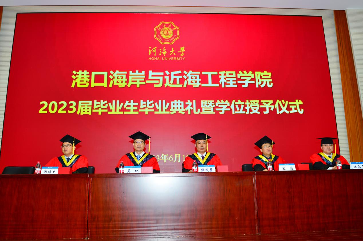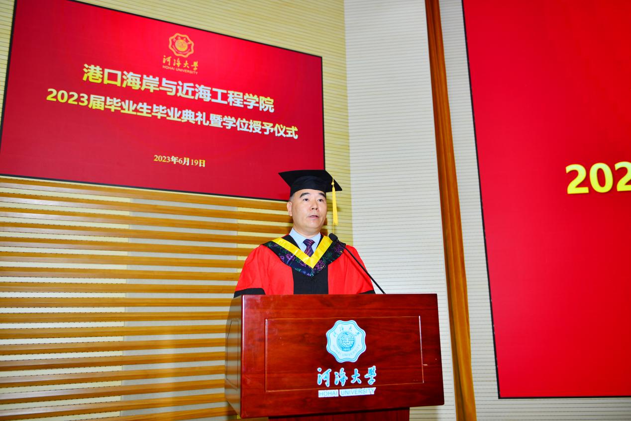在雄壮的国歌声中,毕业典礼正式开始,龚政院长代表学院向全体学生致毕业寄语。对即将踏上崭新征程之际的毕业生们,龚院长提出三点寄语,一要胸怀国之大者,立志担当大任,以青春之我、奋斗之我投身于伟大事业,到新时代新天地中去施展抱负才干;二要服务国家战略,投身强国伟业,在服务“一带一路”、海洋强国等国家战略需求中实现自己的人生价值;三要赓续光荣使命,奔赴诗和远方,以“咬定青山不放松”的执着,积极迎接人生的各种挑战,在下一站遇见更好的自己。