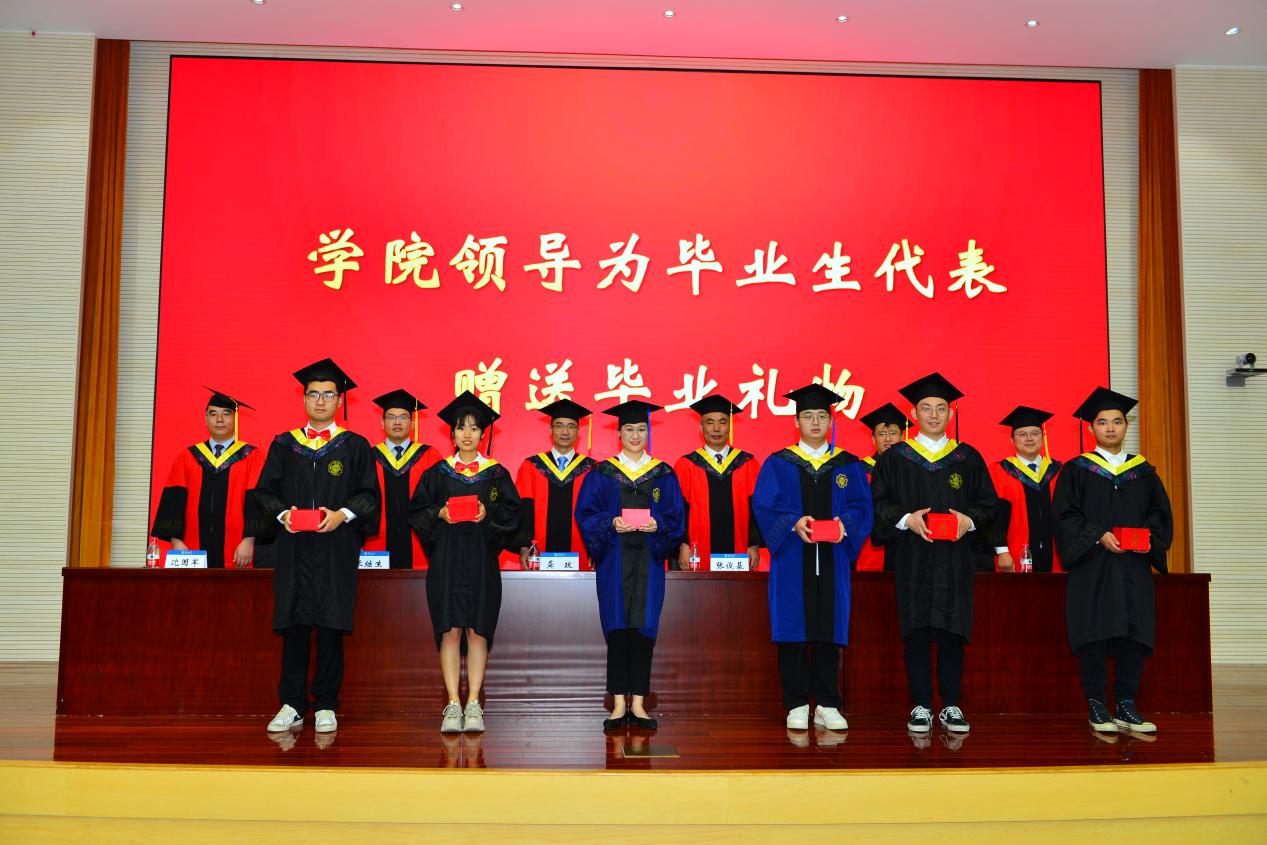 学院全体领导为全体2023届毕业生颁发毕业证书、拨帽穗,并向毕业生代表赠送毕业礼物。