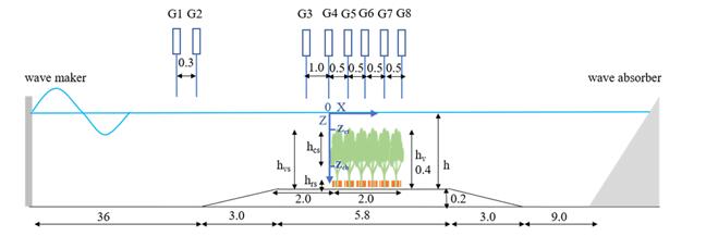 图1 红树林消浪作用实验波浪水槽布置示意图(单位:m)