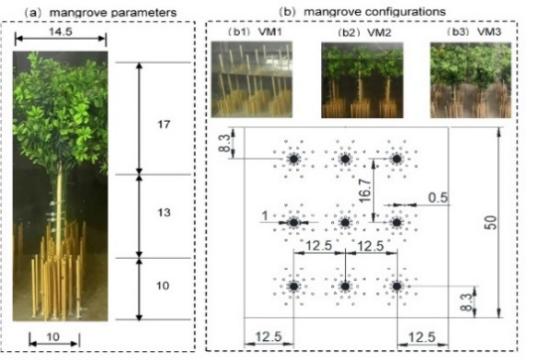 图2 红树林模型示意图:(a)单个红树林模型,(b)红树林平面布局示意图(单位:cm)