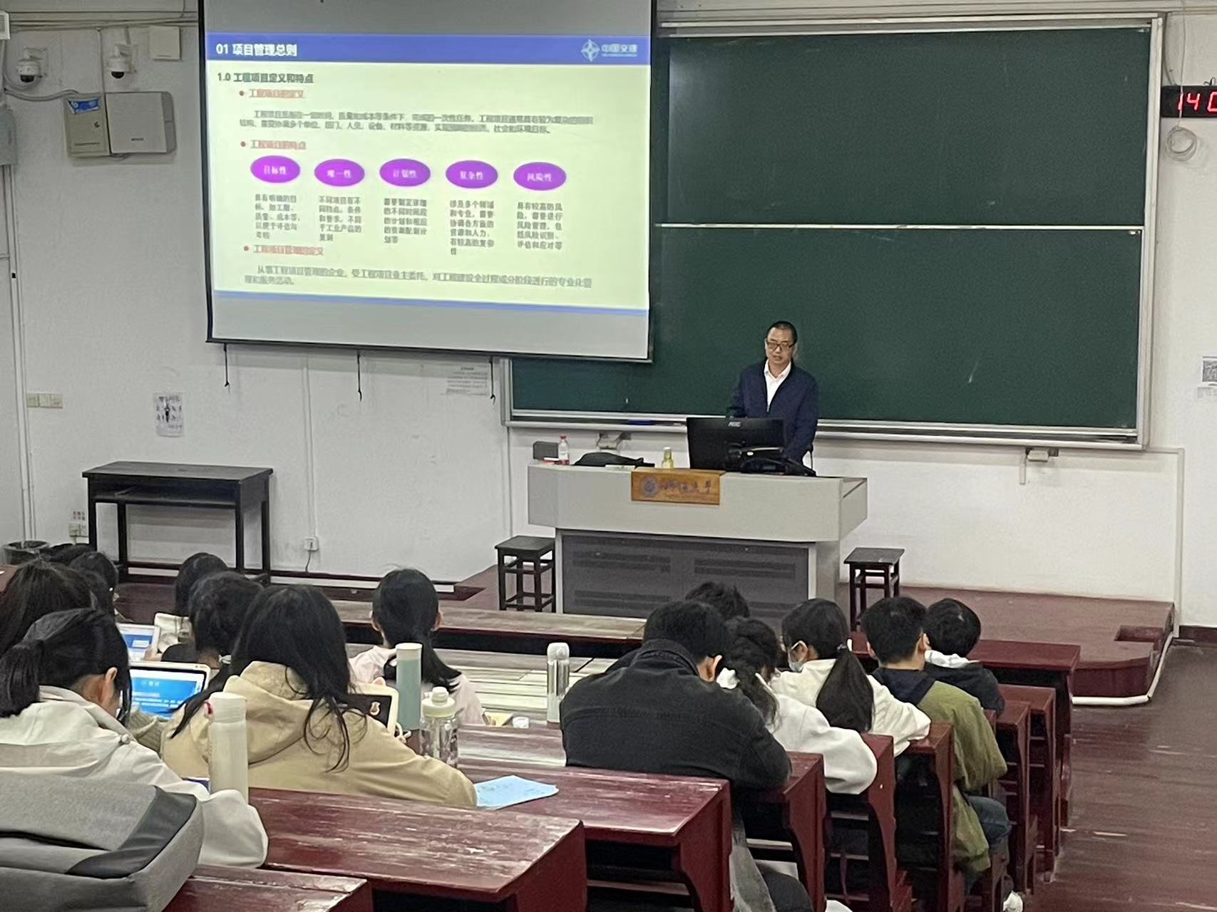 赵辉系我院97届校友,长期在一线从事港口及航道工程、公路和桥梁工程施工技术实践研究。授课从三航局的施工项目标准化管理介绍开始,结合其主持参加的新加坡樟宜海军基地、中船长兴岛造船基地一期工程、港珠澳大桥岛隧工程等国外内大型项目施工管理实践,系统讲解了课程中有关“施工管理”的内容,丰富了《水运工程施工》课程施工管理内容的实践教学方式,激发了学生对施工项目管理过程知识的学习兴趣,取得了良好的教学效果。