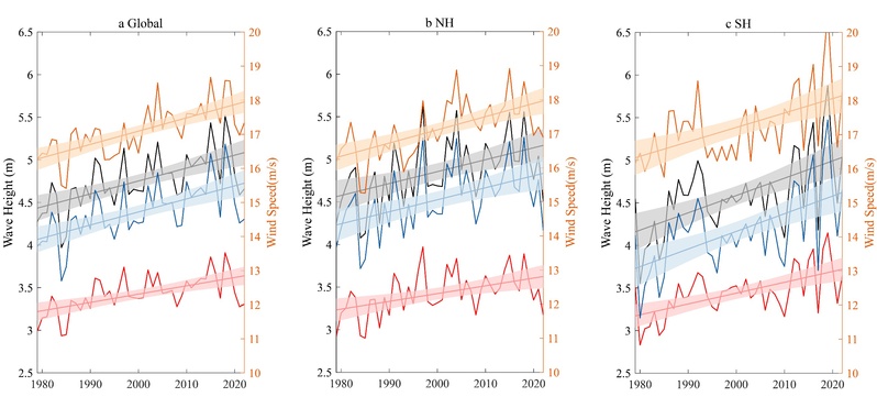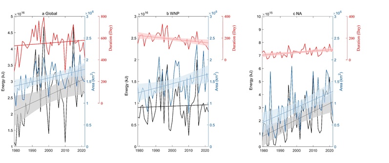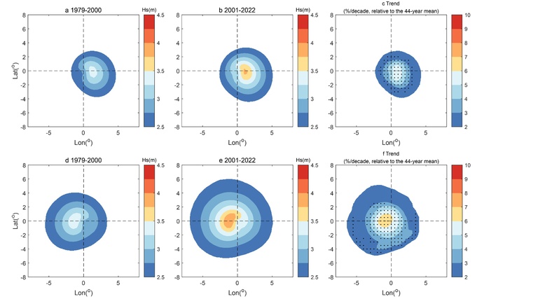 我院河口海岸综合治理与保护研究团队与英国雷丁大学和帝国理工大学研究人员合作,在利用最新的浮标和卫星观测数据充分验证再分析波浪数据ERA5的基础上,通过定义台风浪波高阈值,提取全球波浪场中的台风浪分布特征,分析了1979-2022年台风引起的全球波高极值、影响面积和累积波浪能的变化趋势,推导了累积波能各项贡献率计算公式。研究发现近44年全球台风引起的波高极值增长明显,为0.32%/a,影响面积扩展速率为0.57%/a,累积波浪能增加速率为0.9%/a。全球台风浪累积波能的增加速率是波高增长速率的3倍,这由台风浪影响面积的扩展所主导。全球不同海区台风浪变化趋势差异明显,对于西北太平洋,波高极值和影响面积的增长速率快于全球,为0.41%/a和0.69%/a;但是累积波能的增长趋势不明显,这是由于西北太平洋年平均台风作用时间减少所致。