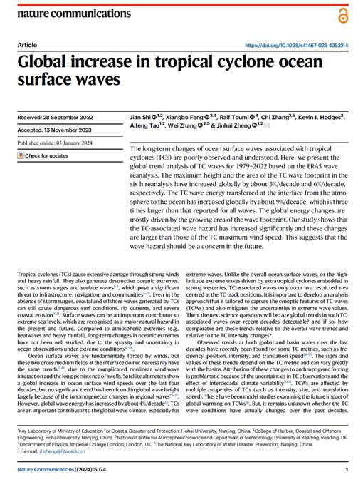 我院时健副教授、郑金海教授、张弛教授、陶爱峰教授、张蔚教授和雷丁大学冯向波高级研究员、Kevin I. Hodges教授以及帝国理工大学Ralf Toumi教授合作完成的研究论文“Global increase in tropical cyclone ocean surface waves”发表在国际学术期刊《Nature Communications》上(//www.nature.com/articles/ s41467-023-43532-4),研究工作得到国家重点研发计划重大自然灾害防控与公共安全海洋专项(2023YFC3007900)的支持。