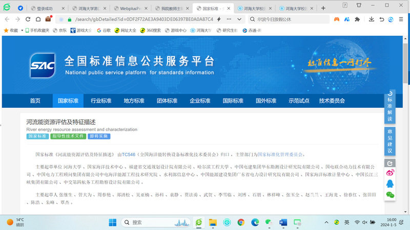 近日,我院张继生教授团队主编的国家标准《河流能资源评估及特征描述》(GB/Z 43465-2023)由国家标准化管理委员会正式发布,并将于2024年7月1日起实施。该标准由全国海洋能转换设备标准化技术委员会(TC546)归口上报及执行。