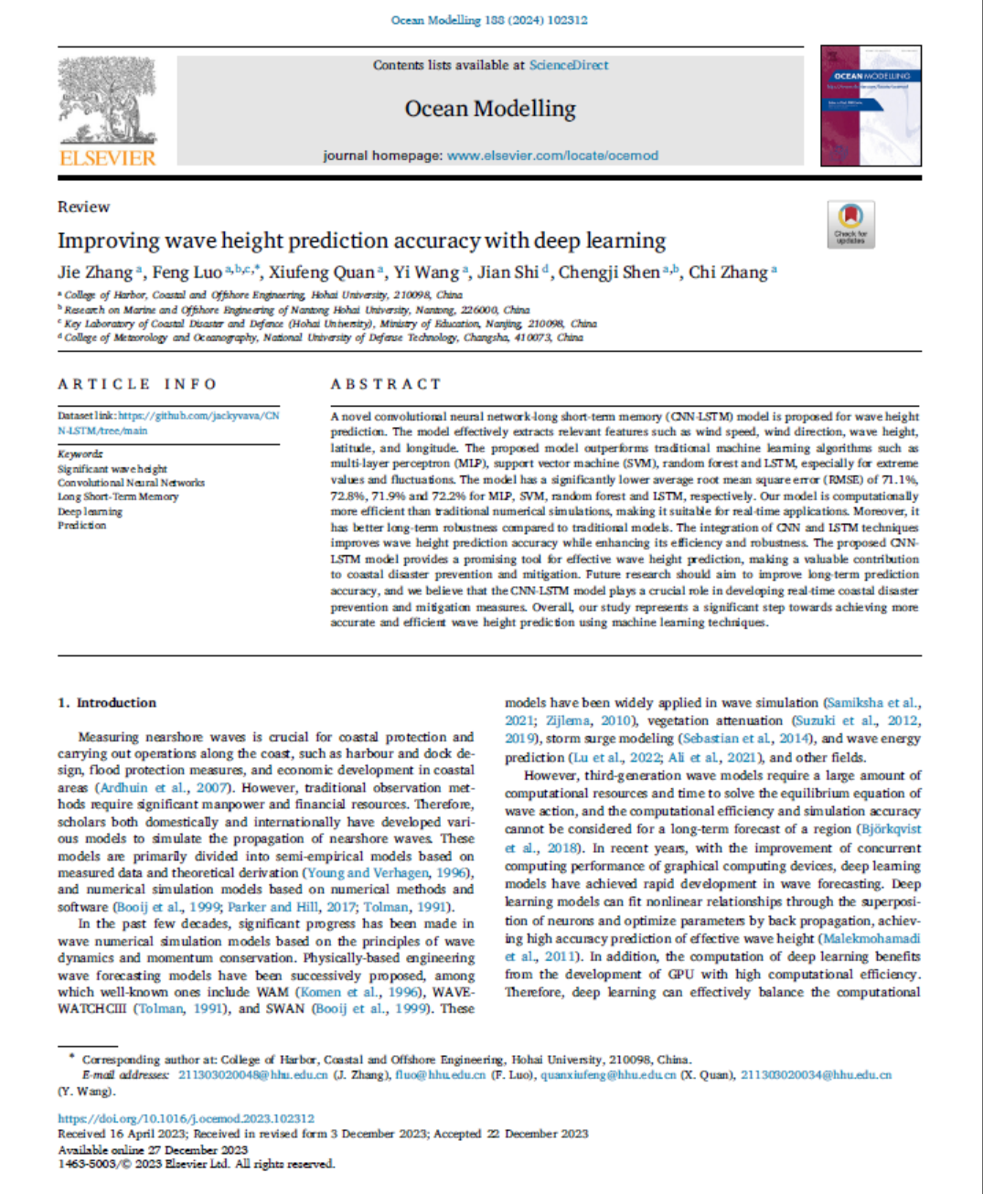 Zhang J, Luo F *, Quan X, Wang, Y, Shi, J , Shen, C, and Zhang, C. Improving wave height prediction accuracy with deep learning[J]. Ocean Modelling, doi: //doi.org/10.1016/j.ocemod.2023.102312