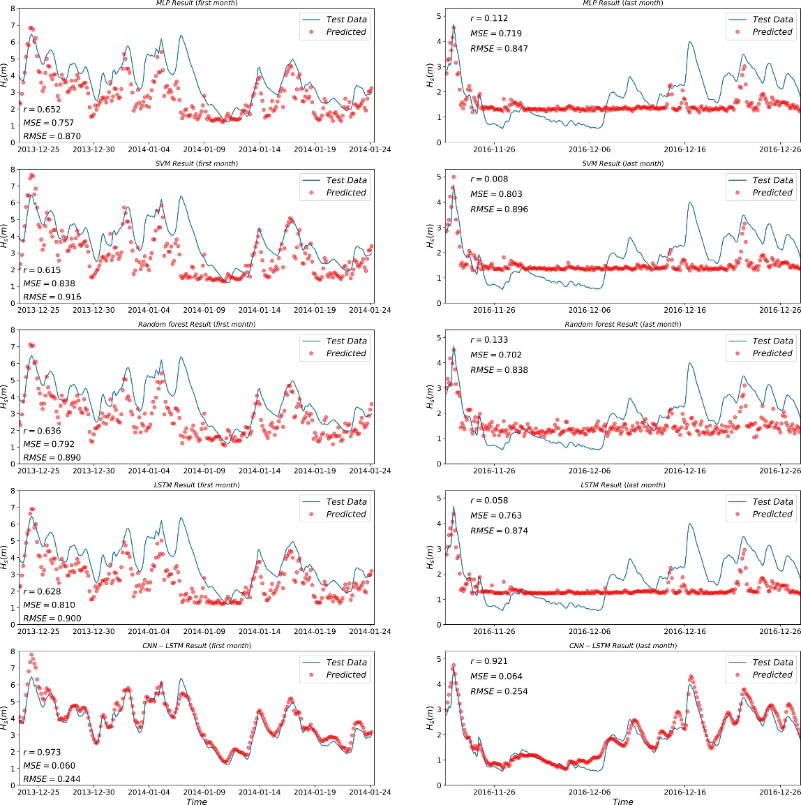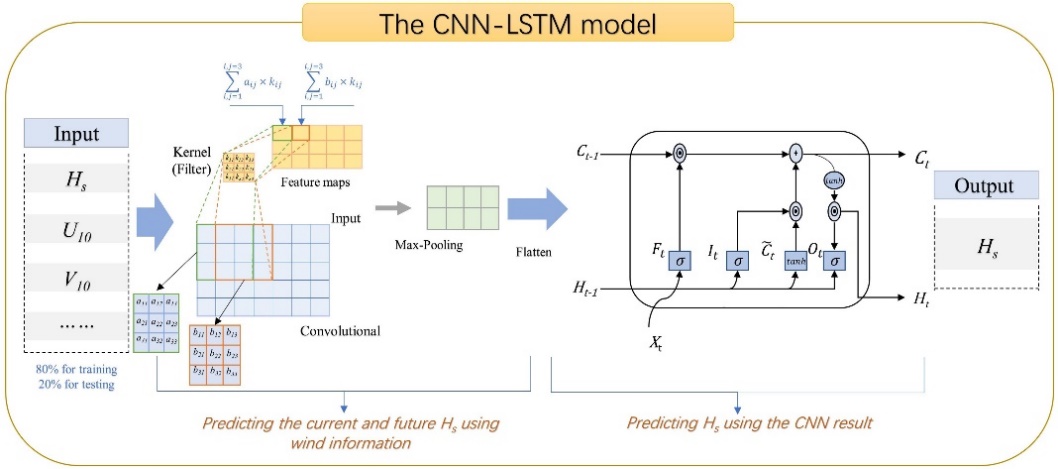 波浪是海洋中最为常见的物理现象,也是全球海洋中含能最高的运动,精准的模拟和预报对于保障航行安全、生产活动以及人民群众生命财产安全等至关重要。人工智能(数据科学)的迅猛发展为提高数值模式的精度、模拟预测的速度提供了新的手段。本文聚焦于将人工智能(AI)的深度学习算法引入海洋模式过程,基于深度学习方法预报波浪的有效波高,并开创性地在算法中耦合空间性和时间性特征(图1)。中长期(3年)预报的误差降低70%以上(图2),计算效率比常规数值模式提高了60%,表明CNN-LSTM模型在波浪预警报及极值波高捕获上具有极大地应用潜力,且能够极大地节省计算资源。该项成果创新性地将深度学习方法应用于波浪预报,提供了一个新的研究视角。