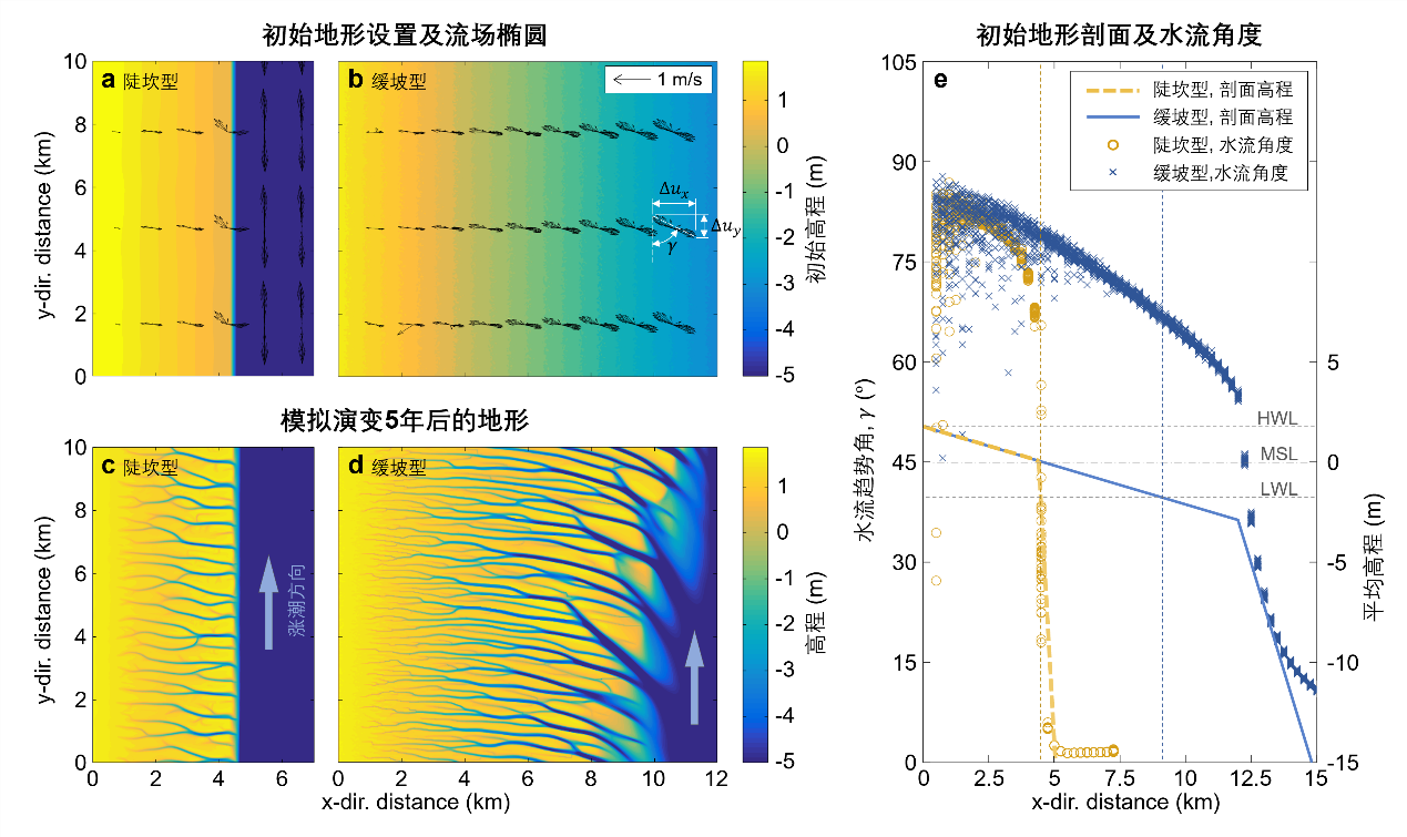 我院海岸带资源与环境研究所师生联合华东师范大学、新西兰奥克兰大学、意大利帕多瓦大学研究人员,通过遥感影像技术分析了全球的21处典型平行潮沟系统(图1),并结合海岸动力地貌学数值模拟对平行潮沟系统的形成与演变规律进行了深入研究。遥感分析的结果表明,相当一部分平行潮沟与岸线近似呈现90°夹角(图2),夹角大小受到剖面地形、水动力、植被等环境因子在沿岸方向上的均匀性控制,其中潮滩剖面形态是主要影响因素。通过对陡坎型和缓坡型两种潮滩演变过程的模拟(图3),发现陡坎型潮滩上沿岸流漫滩时迅速的流向偏转是使潮沟垂直于岸线的根本原因,而缓坡情况下流向平缓的过渡更容易形成弯曲、倾斜的潮沟。
