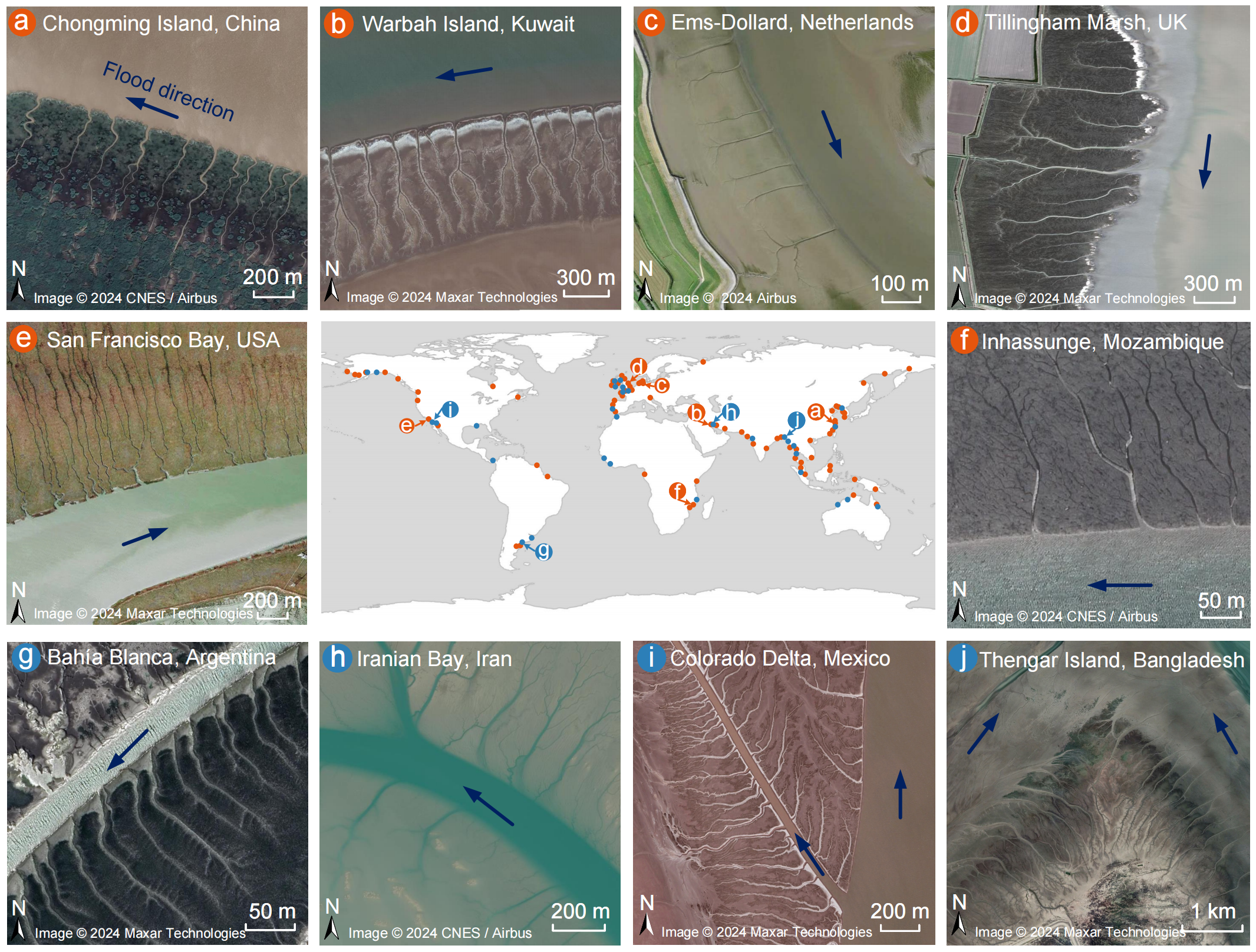 潮沟系统是河口海岸环境中典型的地貌单元,作为海陆间交换水、沙、营养等物质的重要通道,其规模和发育过程决定着潮滩湿地系统的稳定,并对海岸地区生态环境的健康有着深远影响,被誉为滨海湿地的“血管”。潮沟系统的形态千姿百态,以往研究主要关注树枝状的潮沟系统,而鲜有针对平行潮沟的报道。其实,平行潮沟系统在全球范围内也是一种广泛分布的河口海岸地貌结构,该系统的各条潮沟具有规模相似、间距相等、走向平行且与岸线垂直等特点。特别地,这些垂直于岸线的平行潮沟可以在沿岸流主导的环境中产生。虽然平行潮沟系统分布广泛、特征鲜明,但目前系统性研究较少,其形成机制和演变规律尚不清楚。
