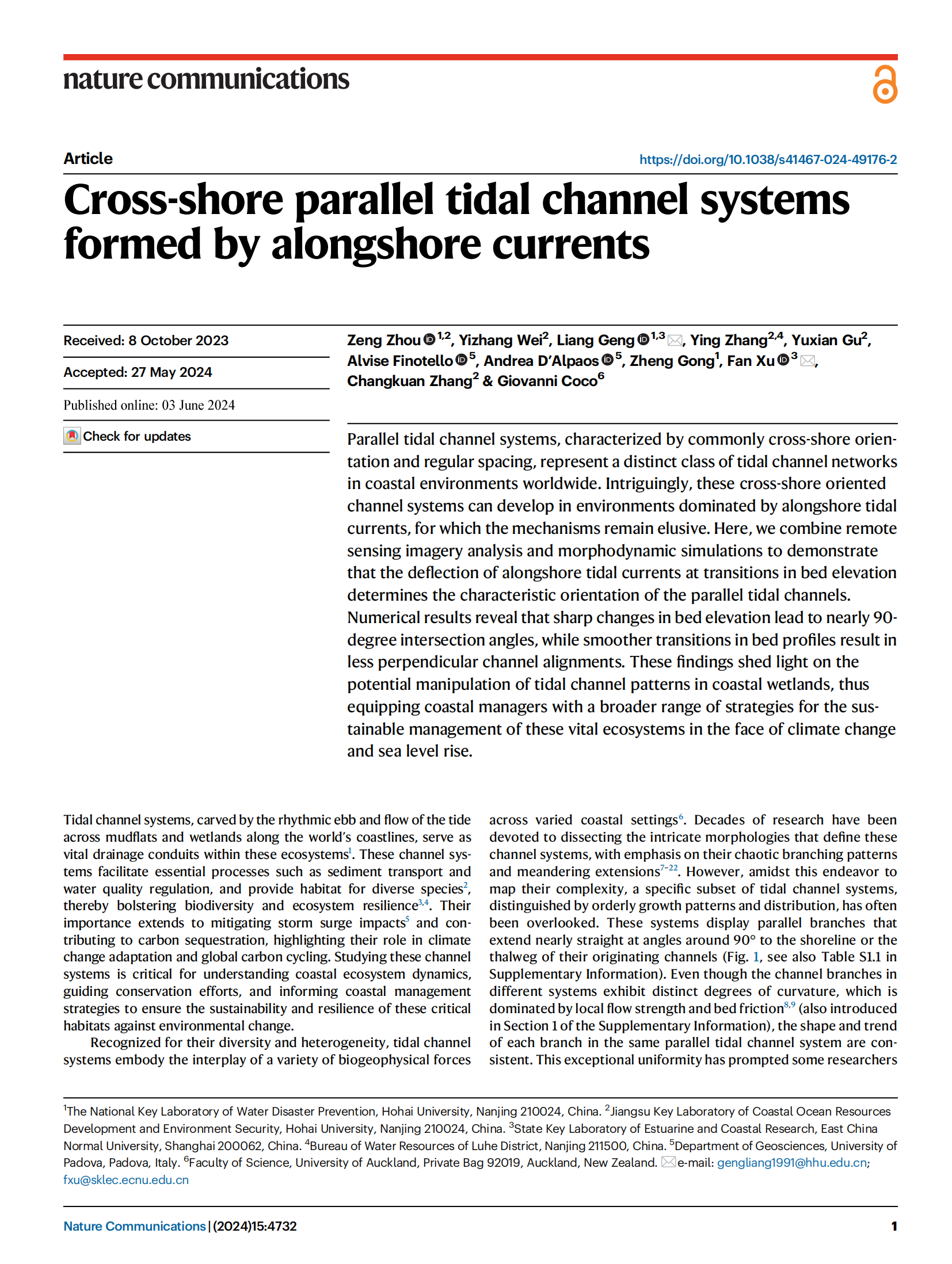 本研究由我院海岸带资源与环境研究所周曾教授、龚政教授、张长宽教授、耿亮博士、张颖硕士、韦以璋博士生、谷玉先博士生和华东师范大学徐凡副研究员、奥克兰大学Giovanni Coco教授、帕多瓦大学Andrea D’Alpaos教授、Alvise Finotello博士共同完成,研究成果在学术期刊《Nature Communications》上发表了题为“Cross-shore parallel tidal channel systems formed by alongshore currents”的研究论文(//www.nature.com/articles/s41467-024-49176-2)。该研究得到了国家重点研发计划项目“典型海岸侵蚀防护与活力海岸构建关键技术(2022YFC3106201)”的资助,对于深入理解海岸地貌系统演变机制、评估海岸生态环境对气候变化的响应规律等具有重要意义。
