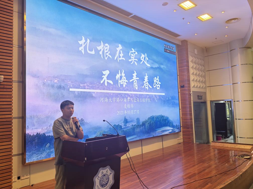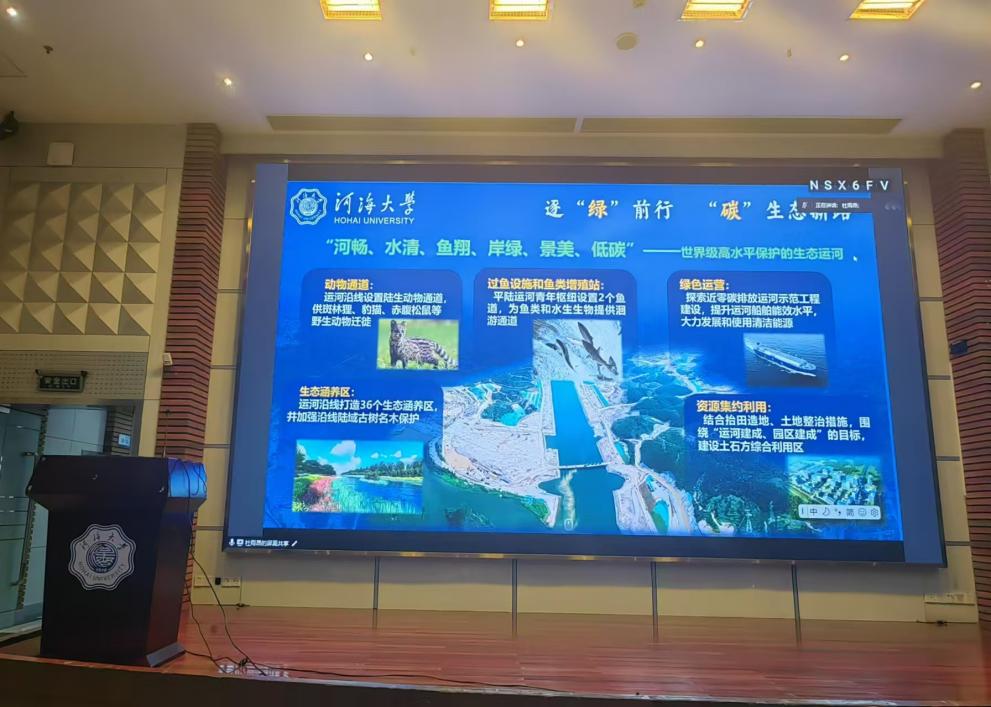 杜雨昂分享杜了研究生博士团开展平陆运河调研实践的经历,简要介绍了平陆运河的施工建设情况及其带来的积极影响,并向同学们展示了实践团成员所参与的工作和获得的成果。