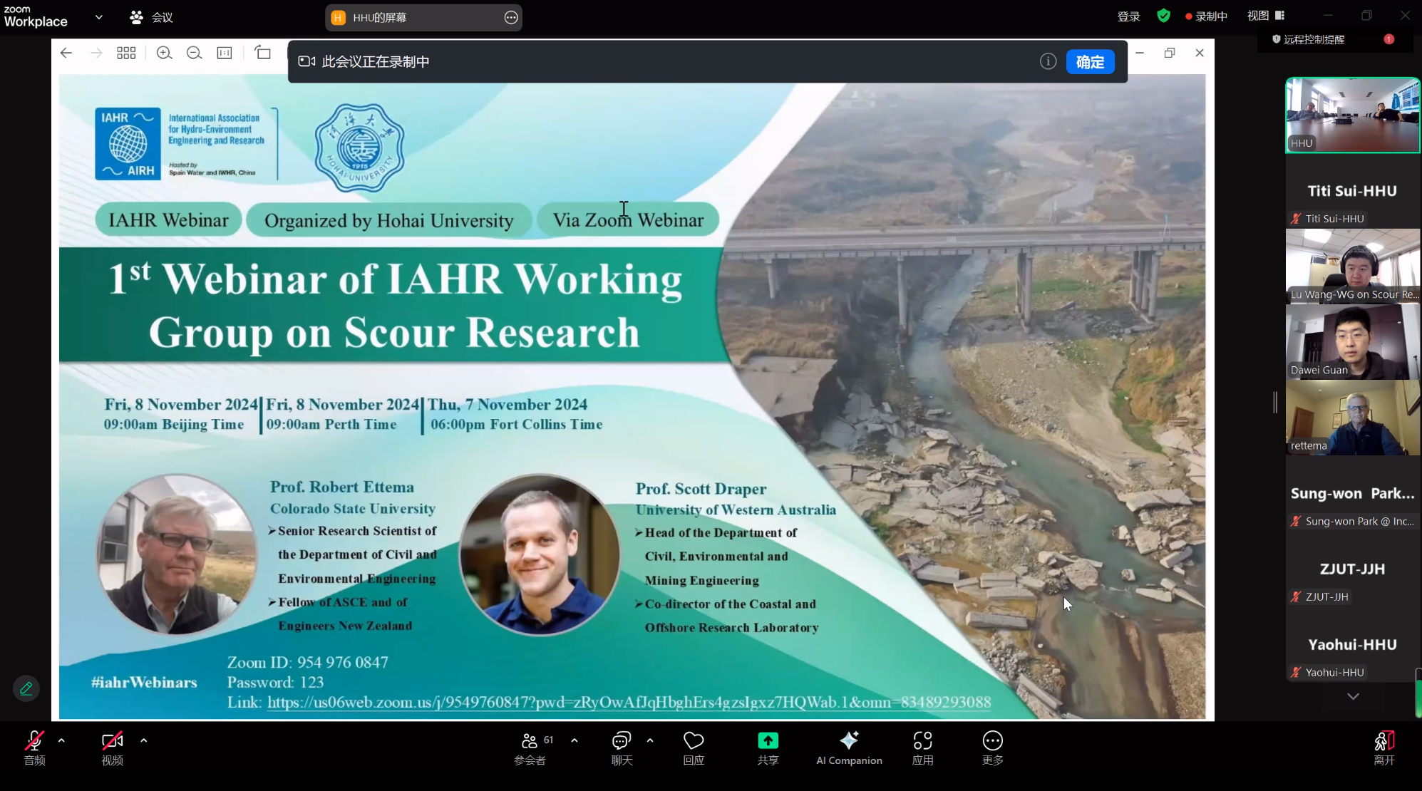 2024年11月8日,我院成功举办国际水利与环境工程学会(IAHR)冲刷研究工作组首次线上学术研讨会(1st Webinar of IAHR Working Group on Scour Research)。