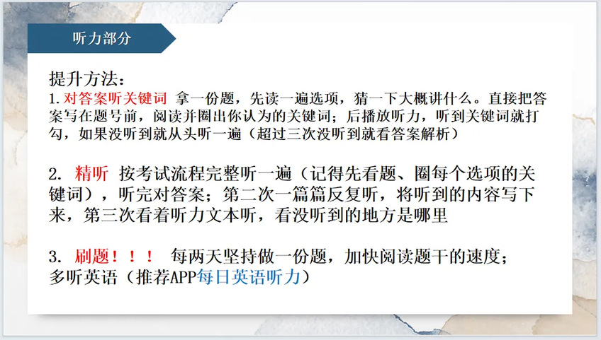 赵安欣从英语四级的考试内容、备考技巧和考试注意事项三个方面,结合自身经验分享应试技巧。