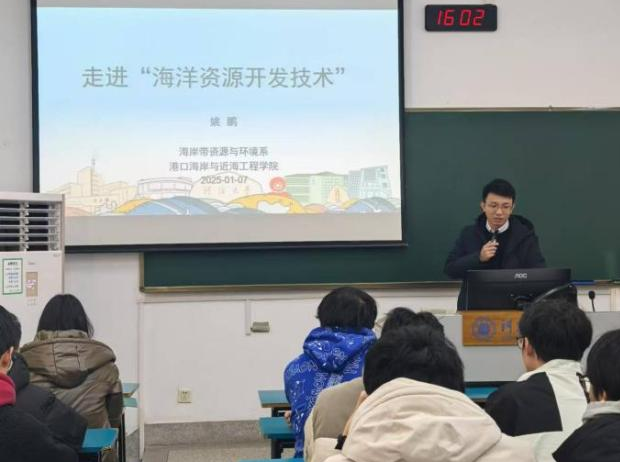 姚鹏老师以“走进海洋资源开发技术”为题,向同学们详细地介绍了海洋资源开发技术专业的历史背景、培养方案设置和发展前景。海资专业的设置背景是紧扣国家战略并瞄准国家社会发展对海洋资源开发类科技人才的需求,以海岸带空间资源开发保护为特色。该专业的设置符合我校“以水利为特色”、“由河向海延伸”的发展战略。姚老师强调在学习和未来工作的旅程中,能力和自信非常重要,要朝着“全球视野、中国灵魂、河海特质”的方向不断提升和进步。