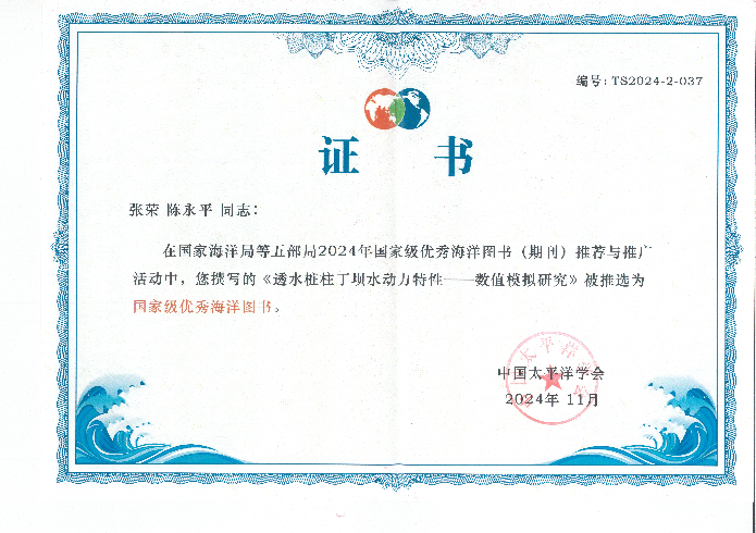 近日,在中国太平洋学会开展的国家级优秀海洋图书(期刊)推荐与推广活动中,由我院张荣副研究员、陈永平教授编写的专著《透水桩柱丁坝水动力特性——数值模拟研究》被评选为2024年度“国家级优秀海洋图书”。