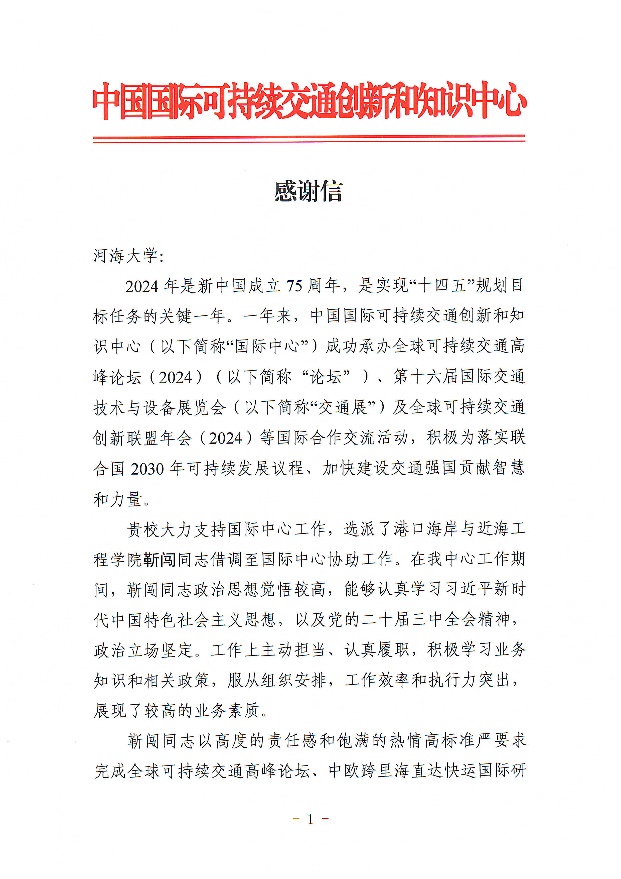 近日,国际中心向我校致信,对我院副研究员靳闯同志在借调期间的贡献给予了高度评价,同时向学校及学院的鼎力支持表达了诚挚的谢意。信中指出,在国际中心工作期间,靳闯副研究员展现出了高度的敬业精神和扎实勤恳的工作作风,在交通国际问题研究及国际合作等方面展现了过硬的业务素质和突出的工作能力,相关研究报告获得了部级领导批示,为推动交通领域的国际合作与发展提供了有力的智力支持。