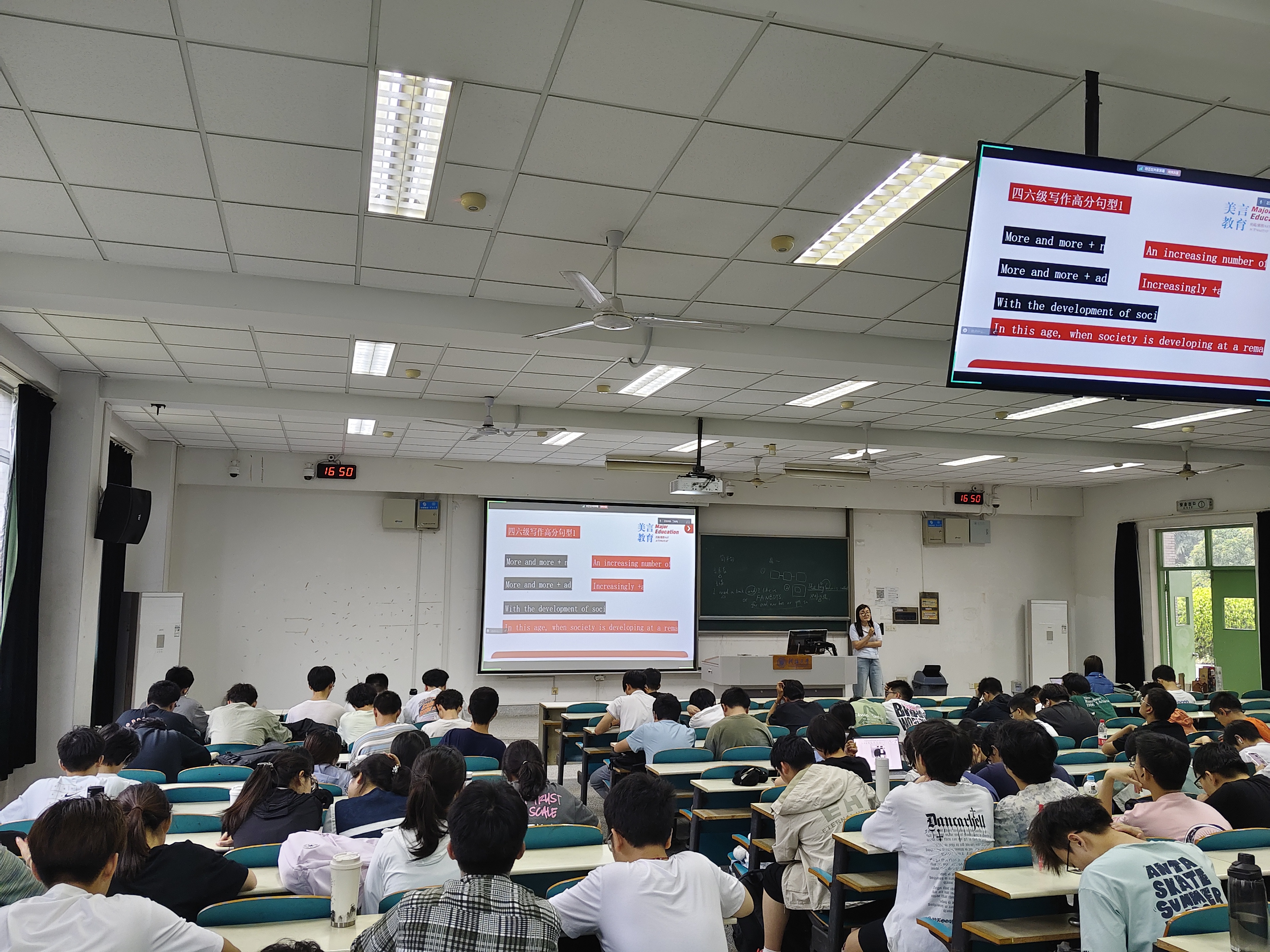 接着,侯玉老师为同学们讲解指导了英语四六级考试中听力部分和写作部分。侯老师总结了近年来的听力试题,带来了许多的实用技巧与同学们分享。在听力部分,侯老师分享:“竖看看相同,相同词就是定位词。横看看不同,不同点就是听题点。相同前后找不同。答案=不同点+相同点。观察出现三次以内的名词短语,通过名词情感来预测题干”等听力技巧,让同学们认识到听力也存在‘套路’,帮助同学们在听力音频播放前,通过观察听力选项来预测答案。”