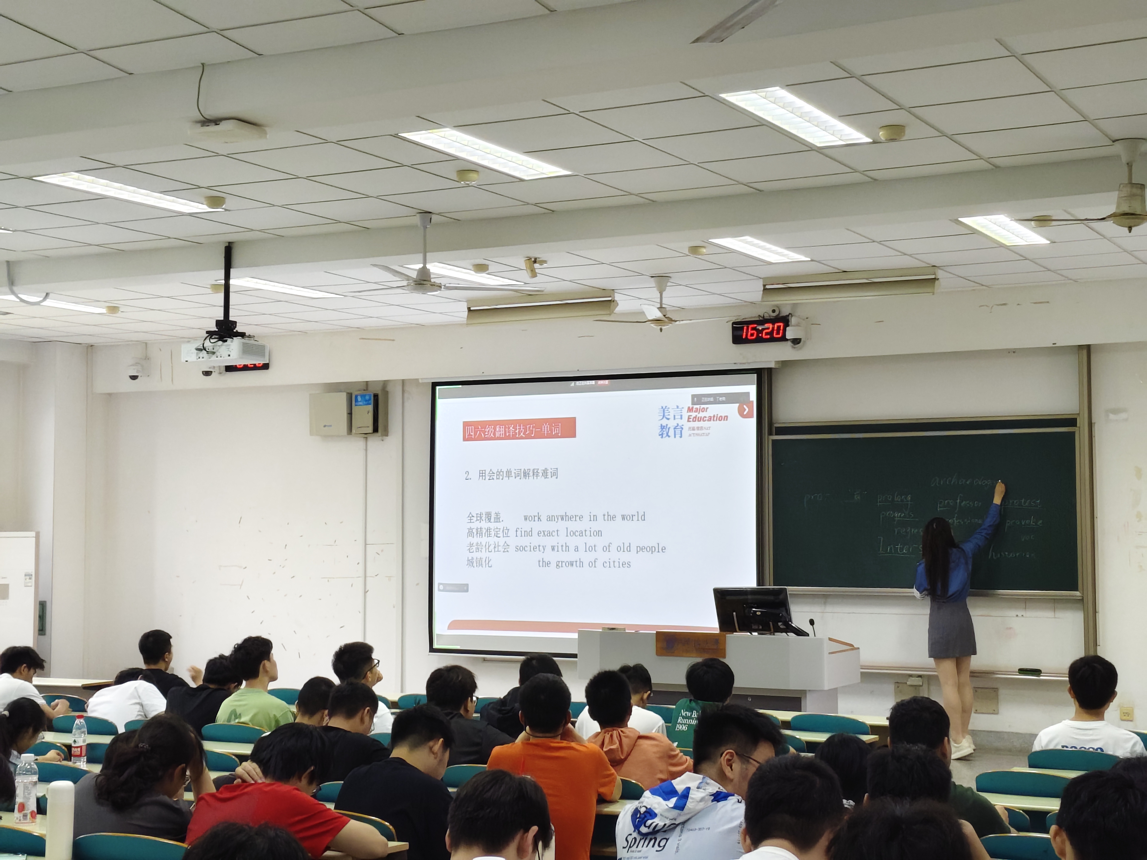首先,丁秋昉老师从英语四六级考试的时间、考试重要性、考试难度等方面强调复习备考的必要性。在英语四六级较容易提分的翻译题型中,为同学们介绍了两个提分关键点:单词和句子。一、单词:要求记住常见的词根用来推测陌生的词汇。做到“以简代繁”,用简单的词代替复杂的词。合理运用“大词随便猜,小词看不见,主干完整即可”的技巧,建议同学们在翻译长难句时先做到认清长难句的句子结构,使用单词的正确形式,优先保证句子的主干完整;二、句子:学会拆分句子,“拆主干→保核心→简修饰”,当同学们面对陌生的句型时,优先保证语法和句子结构正确。在讲解的同时,丁老师积极和同学们互动,向同学们抛出问题,调动大家积极思考,并解答同学们的困惑。
