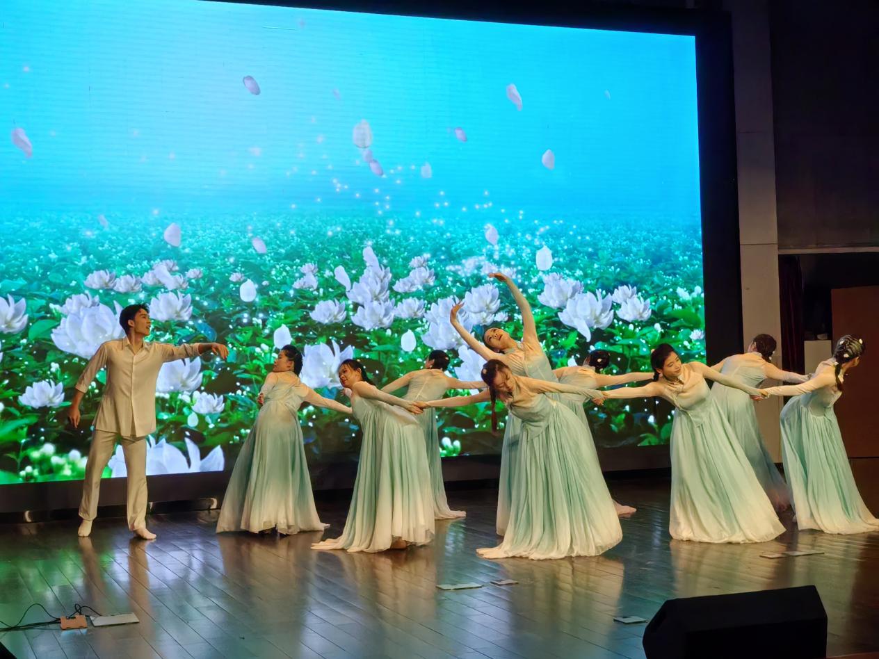 首先,研学团欣赏了由av影片 大学生艺术团表演的舞蹈《茉莉吟》。他们的青春正如茉莉花一般,纯洁而充满活力,在这片热土上绽放,带领着同学们随着舞者轻盈的舞步,重温这片充满诗意的江南水乡。av影片 大学生艺术团是校内综合性艺术组织,包含多个艺术方面,多次在比赛中获得好成绩,其中舞蹈团更是作为省级艺术团,在大艺展中荣获一等奖。