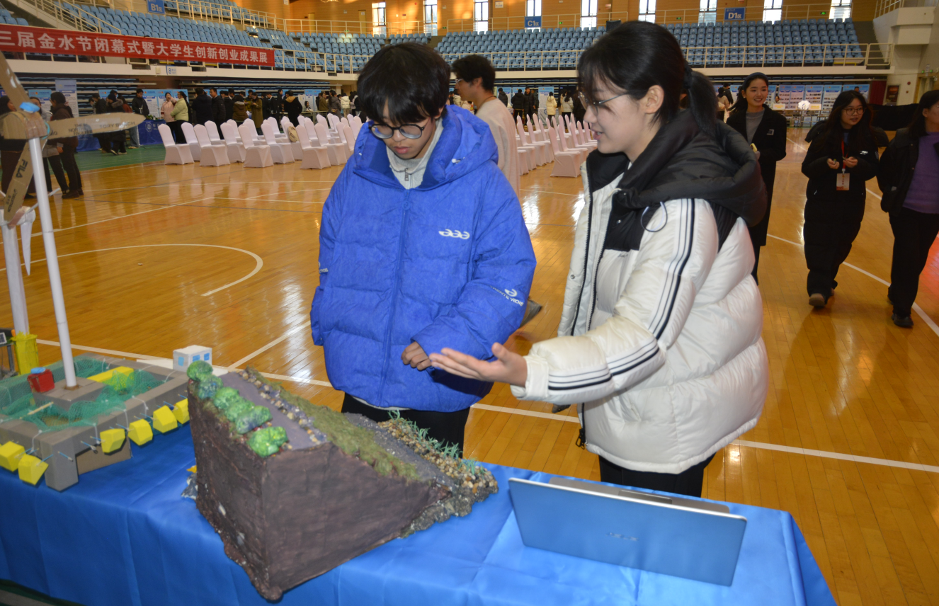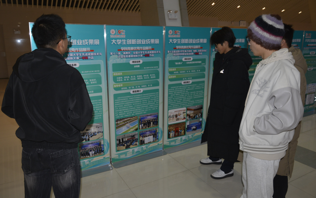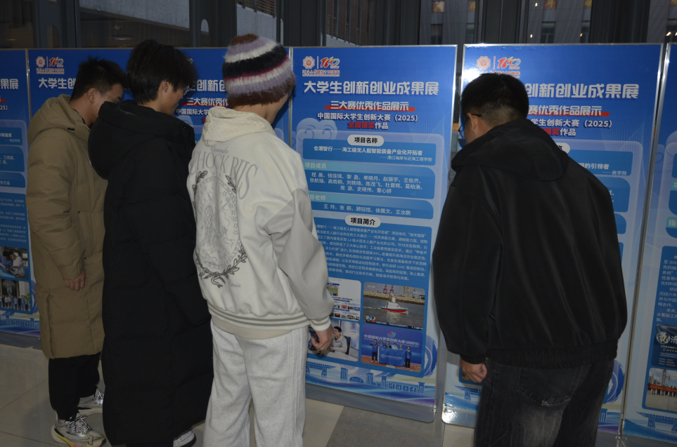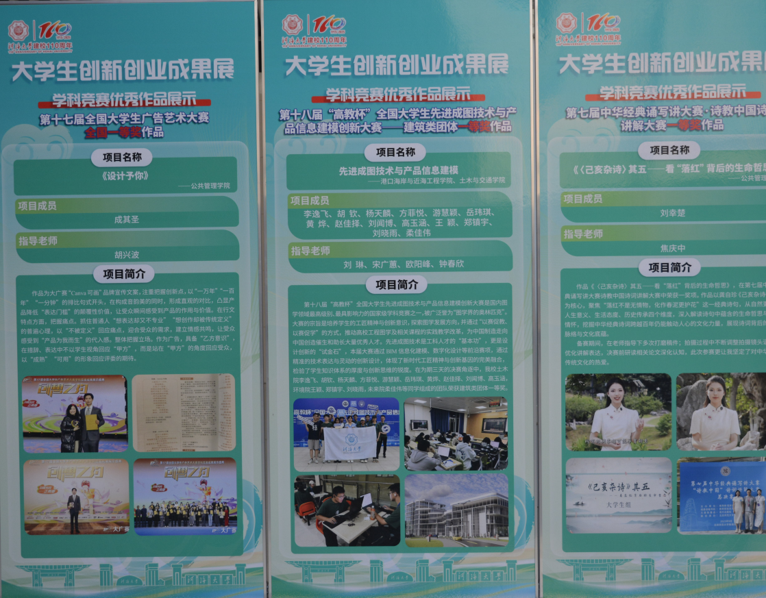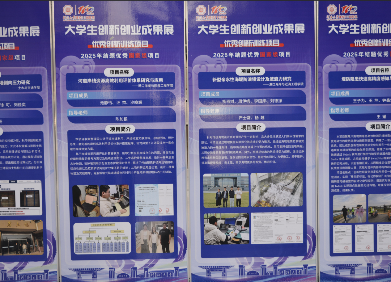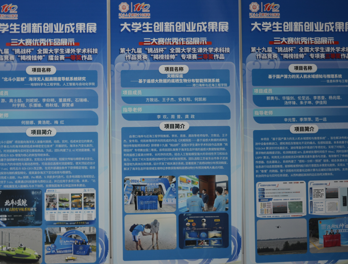在创新创业成果展现场,我院设置专门展区,重点展示国家级竞赛获奖作品及优秀创新训练项目。“三大赛”展区中:《深海哨兵——海上风机多点位冲深智能预警预报系统》获第十九届“挑战杯”全国大学生课外学术科技作品竞赛“揭榜挂帅”擂台赛擂主、特等奖;《天眼探底——基于遥感大数据的底栖生物分布智能预测系统》获赛事“揭榜挂帅”专项赛全国二等奖,《智慧粒子海工冲刷预警预报系统》获该竞赛全国三等奖。在中国国际大学生创新大赛中,《仓潮智行——海工级无人艇智能装备产业化开拓者》在国创赛(2025)中摘得全国银奖。此外,在大学生创新训练项目板块,《河道岸线资源高效利用评价体系研究与应用》《新型亲水性海堤防浪墙设计及波浪力研究》两项项目获评2025年结题优秀国家级创新训练项目。