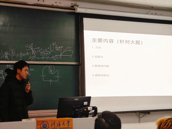 1月4日,2023级举办结构力学、海岸动力学、海洋土力学三门课程习题辅导,黄一诺同学围绕结构力学几何组成分析、静定结构计算等基础模块,清晰梳理知识脉络;贺雪松同学专攻结构力学大题,细致拆解力法、位移法等核心题型的解题思路与技巧;李翔同学系统梳理海岸动力学中波浪理论、泥沙运动等核心章节重点;王康宇同学重点围绕海洋土力学课程,精准提炼土的渗透性、地基承载力等关键考点。现场同学们认真听讲、积极记录,主动汲取学习经验。