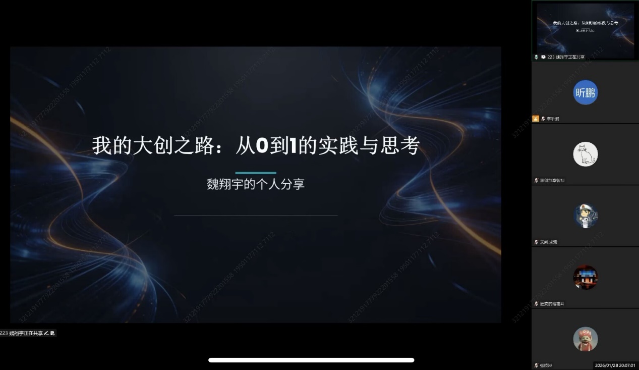 为积极引导学生尽早加入科研团队开展科学研究,促进高水平科研优势向一流人才培养转化,推动学科交叉融合下的创新创业实践能力培养,av影片 在寒假期间开展线上av影片 大学生创训宣讲会,特邀往届优秀团队负责人魏翔宇于1月28日通过腾讯会议进行,旨在分享科研经验、搭建交流平台,激发学生科研热情,助力创新创业能力的全面提升。